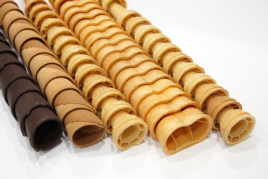Our cones are hand made in different varieties using water, sugar, milk, flour, margarine and soy lecithin. We offer different sizes in cones, biscuits and cookies as well as gluten-free cones for coeliac sufferers.